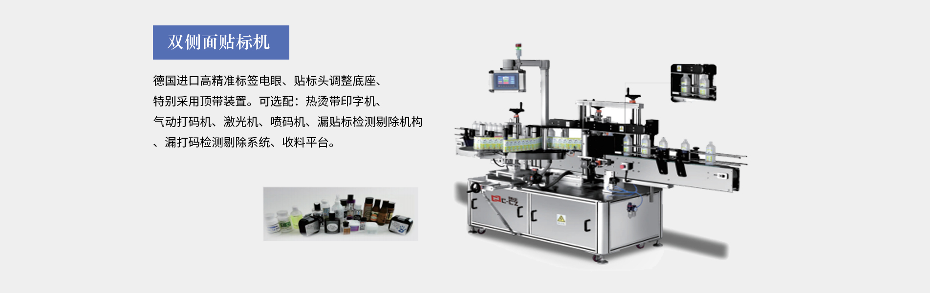 本公司生產(chǎn)的口服液貼標(biāo)機(jī)適合細(xì)長(zhǎng)形圓柱體瓶圓周表面的不干膠標(biāo)簽自動(dòng)貼標(biāo),口服液瓶等,采用彩色人機(jī)界面,離合器設(shè)計(jì),使標(biāo)簽張緊力更加穩(wěn)定,便于提高貼標(biāo)精度3、西門(mén)子PLC控制,德國(guó)、日本光眼,高精度步進(jìn),貼標(biāo)速度可達(dá)30米/分鐘,可加裝色帶打碼機(jī)、或者熱轉(zhuǎn)印機(jī)??诜嘿N標(biāo)機(jī)多為圓瓶貼標(biāo)機(jī)適用于瓶身長(zhǎng),直徑的產(chǎn)品(玻璃塑料都可以,材質(zhì)不限),同時(shí)可加工粉針劑瓶、采血管、水針劑瓶、眼藥水瓶、圓管等,專(zhuān)門(mén)針對(duì)...